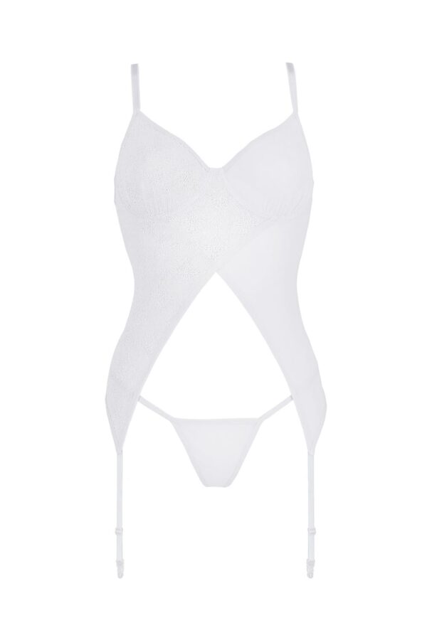Okouzlující korzet Adelina je z jemného bílého elastického tylu a krajky. Neobvyklý střih a dokonale integrovaná krajka dělá tento kousek prádla naprosto úžasným a ještě více pak vaše tělo.