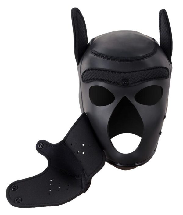 Pružná neoprenová maska psa. Velice příjmená na dotek. Čenich je odnímatelný a po odejmutí je volný přístup na rty.