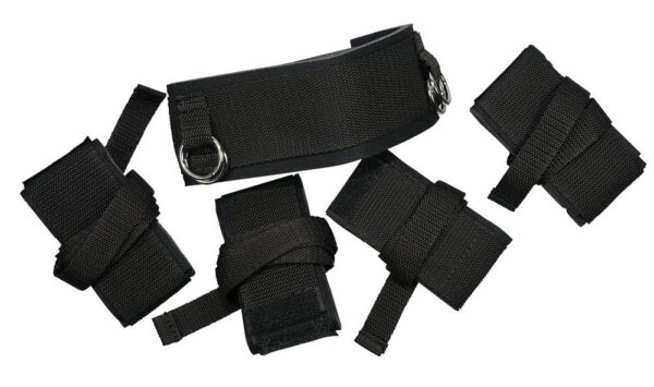 Tenké nepromokavé popruhy spojují pouta na zápěstí a kotnících s límcem na krku. Popruhy měří 132 cm, pokud nejsou nastaveny. Pomocí popruhů můžete buď vytvořit zcela vzpřímené držení těla nebo upravit popruh tak, abyste dostali svoji subinku do jaké pozice chcete. Obě paže lze individuálně nastavit. Všechny pouta jsou na suchý zip.