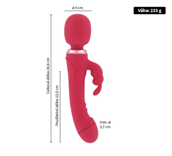 Z jedné strany je to silná masážní hlavice o průměru 5 cm s flexibilním krkem. Z druhé strany vás potěší realisticky vytvarovaný vibrátor s kratší částí na klitoris – dokonalým králíčkem s čumáčkem a oušky. Tato část naráz potěší jak váš G-bod, tak i klitoris.