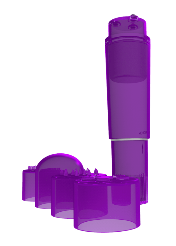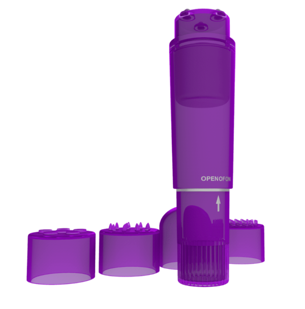 Tento malý vibrátor má čtyři nástavce, jeden hladký a tři s různými výstupky.