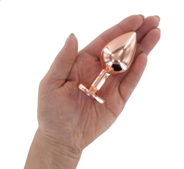 Originální kovový anální kolíček v barvě růžového zlata ozdobený růžovým kamínkem, který je vybroušený jako pravý diamant. To bude láska na první pohled.
