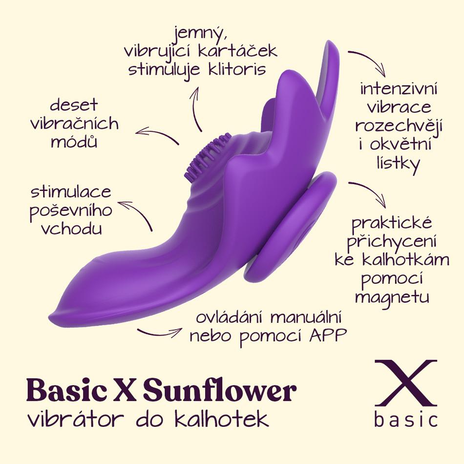 Toužíte po vzrušení, které se vám přizpůsobí, a přitom zůstane diskrétní? Vyzkoušejte BASIC X vibrátor do kalhotek. Jeho ergonomicky tvarované a tenké tělo dokonale kopíruje ženské křivky, takže je téměř neviditelný, zatímco silikonový terčík s jemným kartáčkem se postará o přesnou stimulaci klitorisu. Vibrace se navíc rozlévají do okvětních lístků, které přilnou k vašemu tělu. Druhý výstupek stimuluje poševní vchod pro ještě intenzivnější prožitek.
