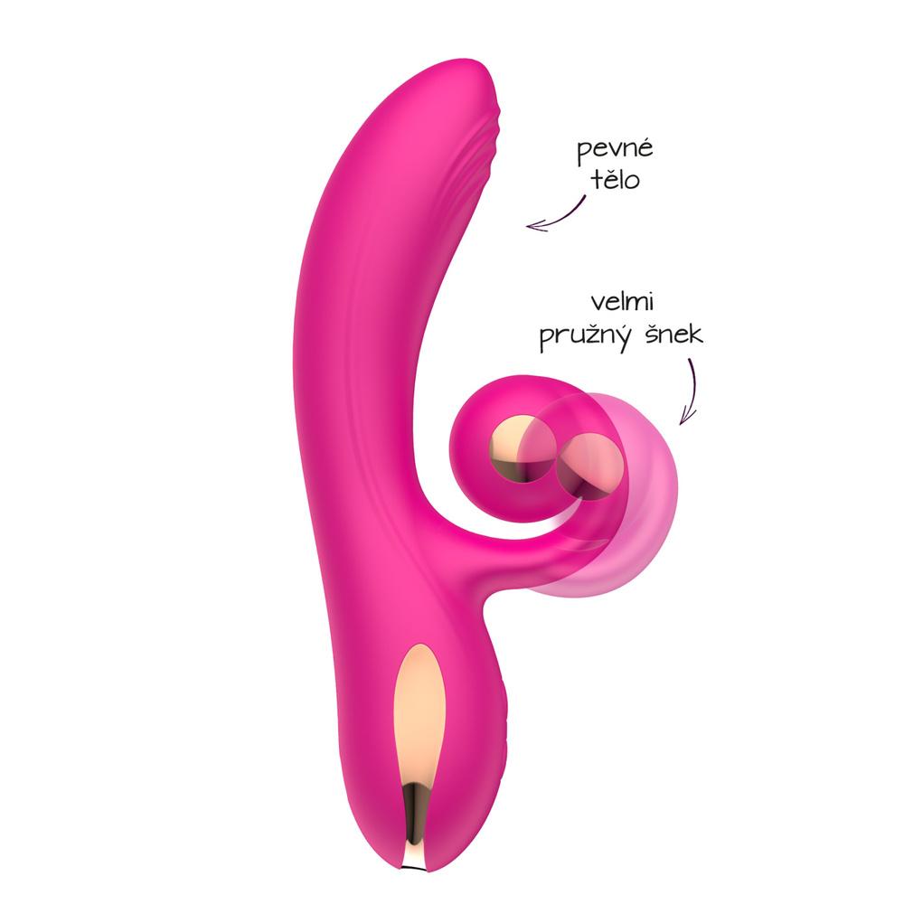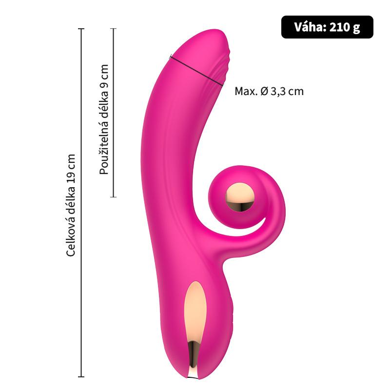 Pro klitoris je určen výběžek ve tvaru malého šneka – pružný, hladký a vibrující v rytmu těla vibrátoru. Obě části můžeš ovládat samostatně nebo je kombinovat podle nálady. Vibrace i rotace ti nabízí 10 režimů – od jemného vibrování až po silné pulzace a intenzivní rotaci.