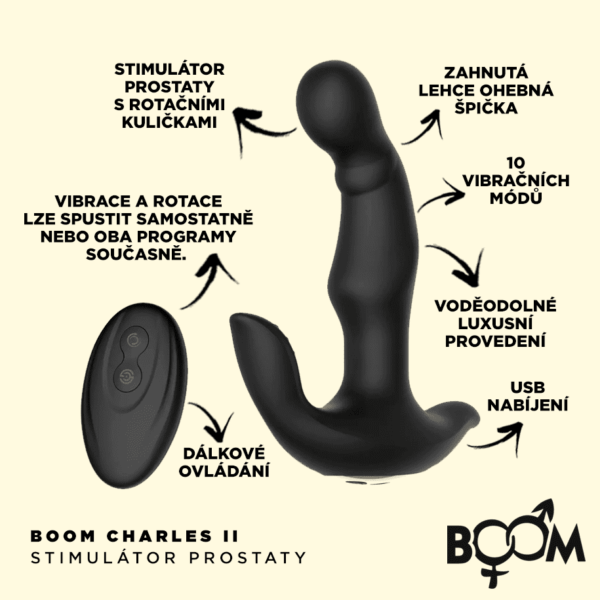 Stimulátor prostaty s rotačními kuličkami. Tento ero-produkt BOOM Charles II stimulátor prostaty na dálkové ovládání – černý (zařezená v: Erotické pomůcky | Anální hračky | Anální hračky, kolíky, kuličky) je nabídce velkého sexshopu. Aktuální cena (1599 Kč) je včetně 21 % DPH. Více informací je přímo na e-shopu: