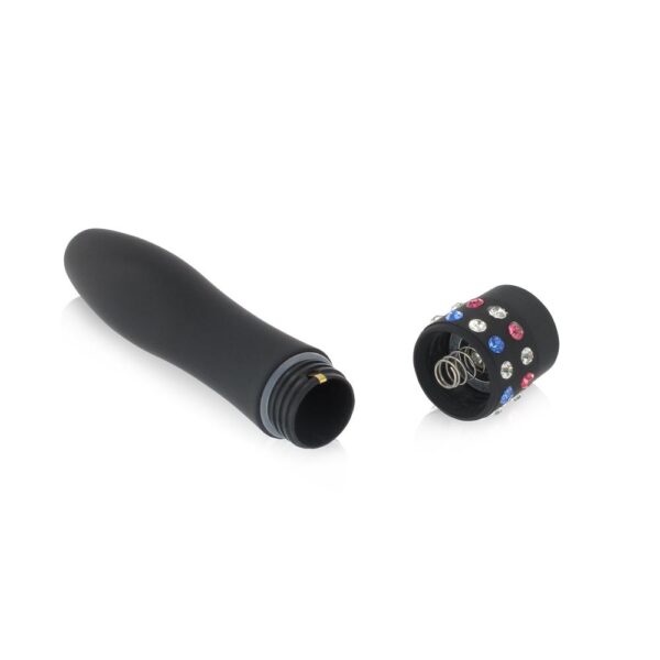 Tento minivibrátor ozdobený dvěma řadami bílých, červených a modrých kamínků bude šperkem mezi vašimi erotickými pomůckami.