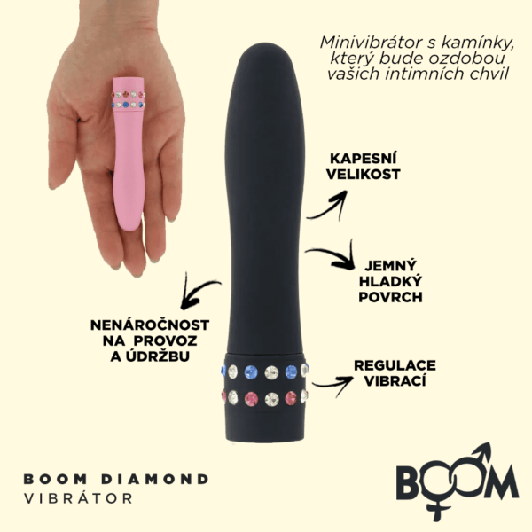 Minivibrátor s kamínky, který bude ozdobou vašich intimních chvil. Tento ero-produkt BOOM Diamond vibrátor černý (zařezená v: Sexuální a erotické pomůcky | Vibrátory a dilda | Vibrátory) je nabídce velkého sexshopu. Aktuální cena (149 Kč) je včetně 21 % DPH. Více informací je přímo na e-shopu: