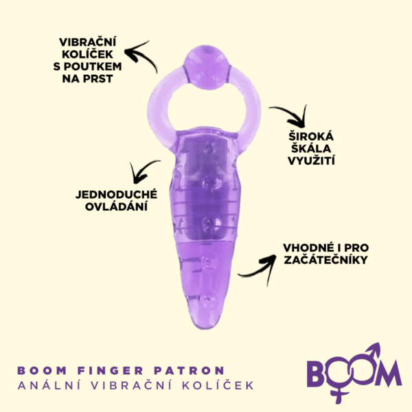 Vibrační kolíček s poutkem na prst, vyrobený z příjemného gelového materiálu. Tento ero-produkt BOOM Finger Patron anální kolíček vibrační fialový (zařezená v: Sexuální a erotické pomůcky | Anální hračky, kolíky, kuličky) je nabídce velkého sexshopu. Aktuální cena (99 Kč) je včetně 21 % DPH. Více informací je přímo na e-shopu: