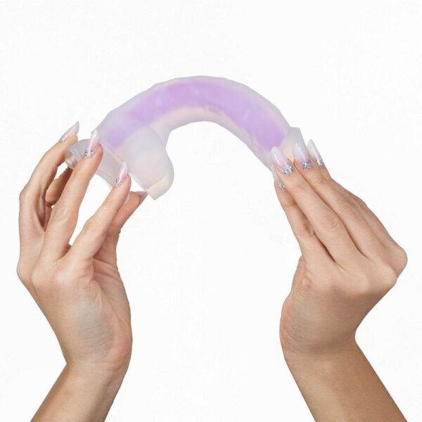 Krásné flexibilní dildo z jemného dvouvrstvého silikonu. Vnitřní část je fialová a ve tmě svítí.