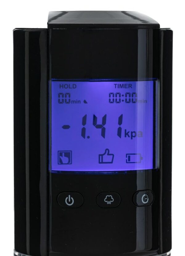 ovládací jednotky (černá část s tlačítky), jednotka je odnímatelná. Nikdy ji neponořujte do vody! Na display se ukazuje míra dosaženého podtlaku v kPa. Dále jsou zde ikony manuálního nebo chytrého módu, stav baterie a časovač.