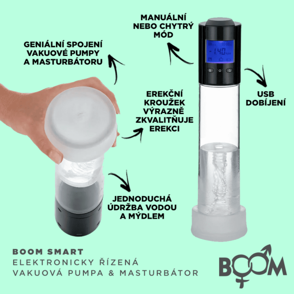 Dobíjecí vakuová pumpa a masturbátor v jednom. Tento ero-produkt BOOM Smart elektronicky řízená vakuová pumpa (zařezená v: Erotické pomůcky | Vakuové pumpy) je nabídce velkého sexshopu. Aktuální cena (1999 Kč) je včetně 21 % DPH. Více informací je přímo na e-shopu: