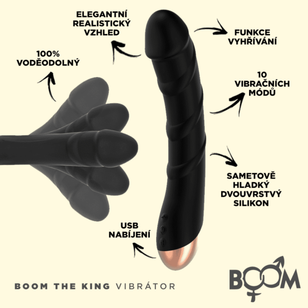 Vibrátor BOOM The King má lehce realistický vzhled – vytvarovaný žalud. Prohnutý tvar, drážky na povrchu a velmi pružné tělo tohoto vibrátoru vás spolu s deseti druhy vibrací vynesou až do samého nebe.