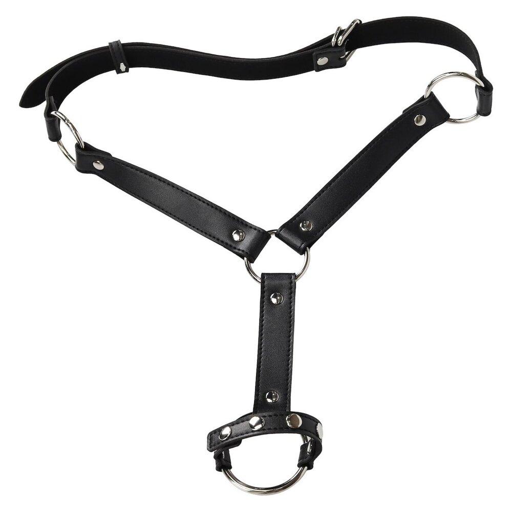 Materiál z PVC v koženém vzhledu je pevný, ale na těle příjemný, kovové prvky dodávají odolnost a jistotu při každém pohybu. Všechny části jsou nastavitelné, takže si snadno doladíš obvod paží i usazení postroje podle své postavy. Erekční kroužek s průměrem 5,2 cm přidá pevnější sevření, podpoří erekci a umocní vzrušení během svazování.