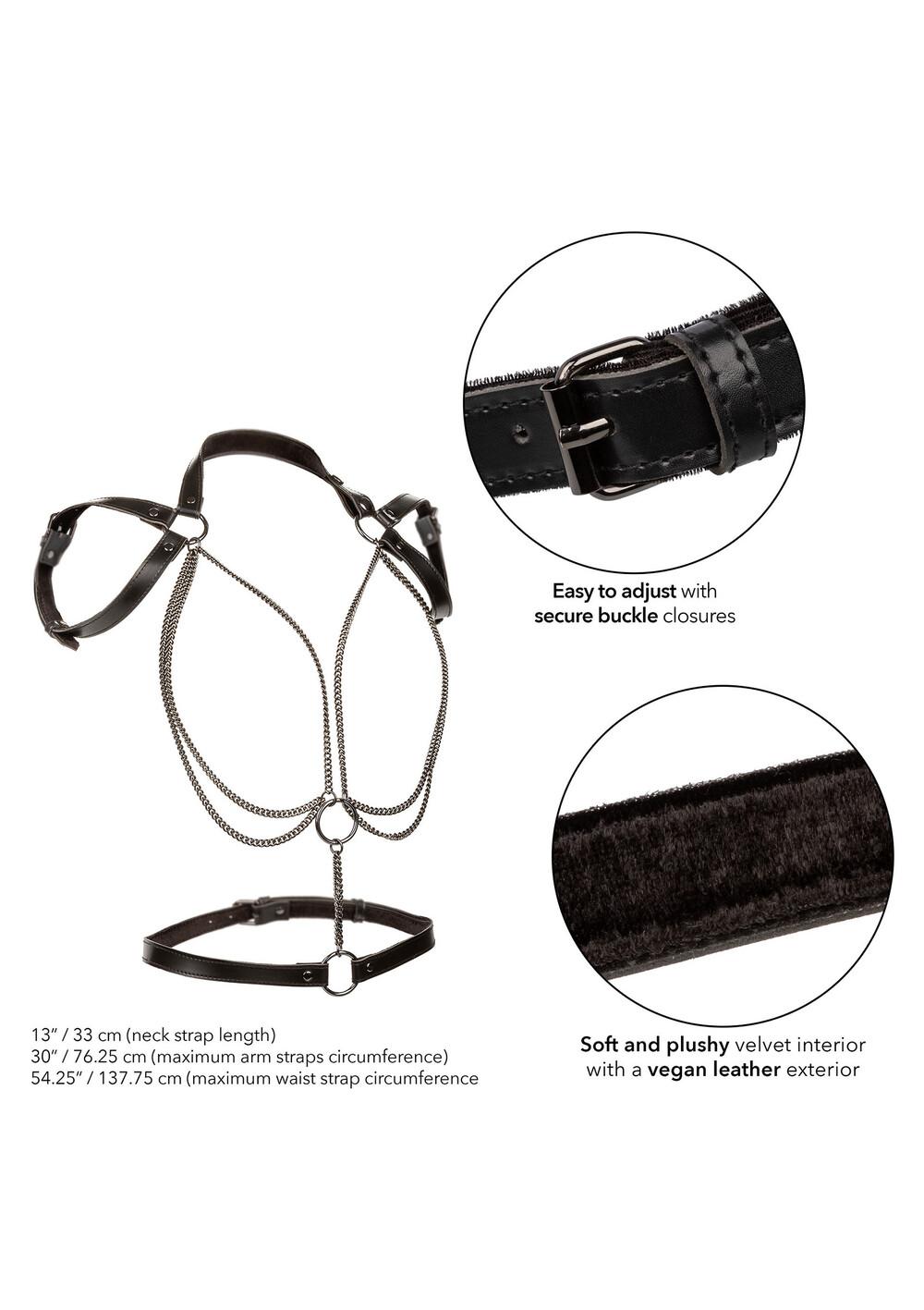 Postroj je šitý tak, aby perfektně seděl a je vybaven snadno nastavitelnými přezkami, které se přizpůsobí postavě. Kovový řetízek dodává ostrou rafinovanost.