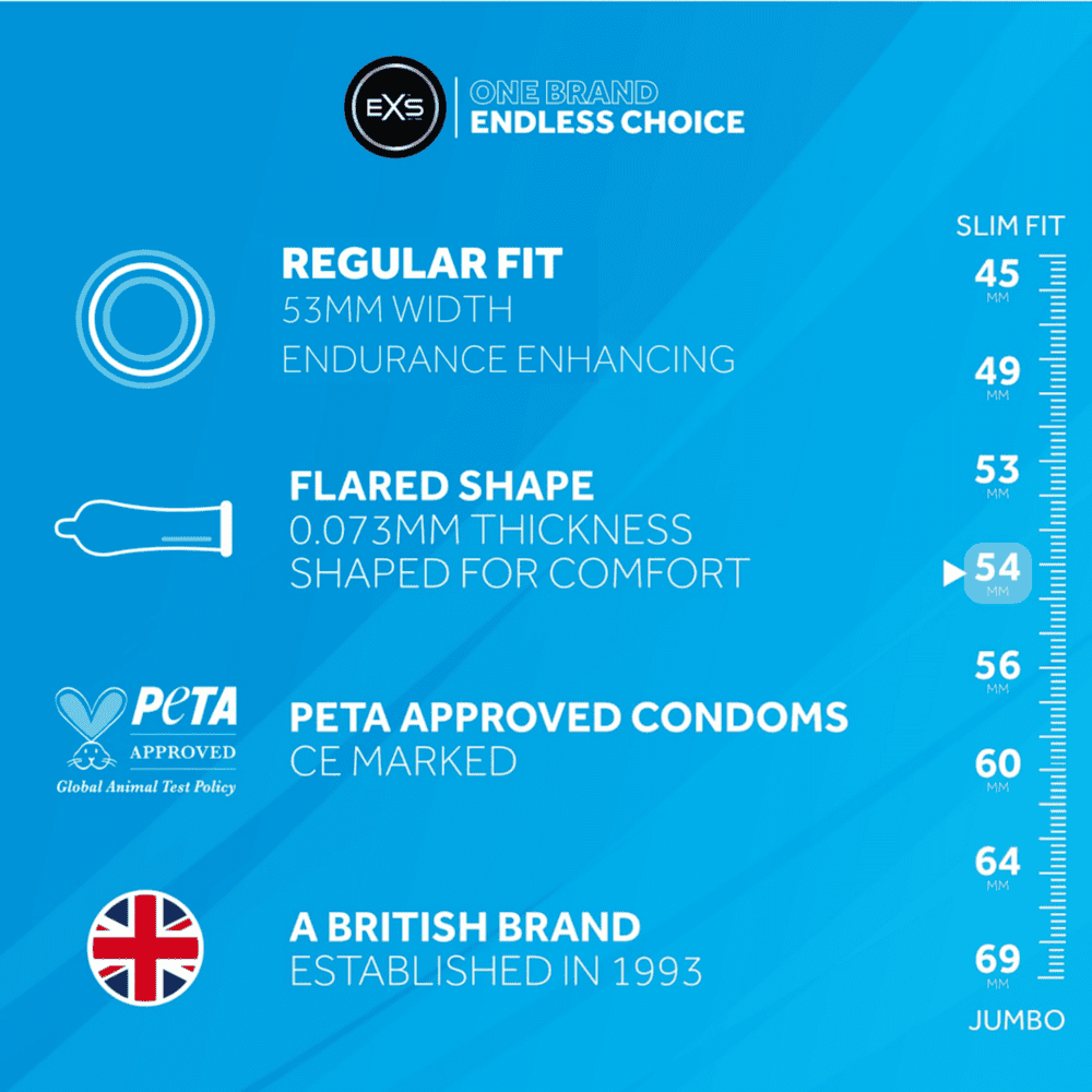 Přírodní latex, klasický tvar s rezervoárem a silikonem lubrikovaný kondom. Kondomy EXS Endurance Delay mají nominální šířku 53 mm a jsou vyrobeny z přírodního latexu. Každý kondom je lubrikován zvenku a uvnitř má anestetický lubrikant 1% lidokain (Lidocaine Hydrochloride 1%), který by měl být vmasírován především do hlavy penisu. S kondomy EXS Endurance Delay vydržíte déle při milování!