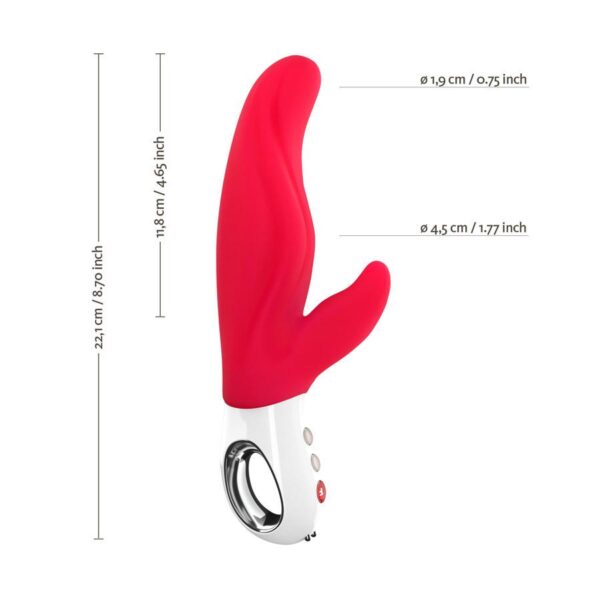 Tento elegantní vibrátor není jiný. Splní vám spoustu přání, a to nejen díky svému propracovanému tvaru. Hlavní část vibrátoru má úzkou lehce zahnutou špičku – dostane se až k děložnímu čípku, což je, jak se ukázalo, místo, kde také dochází ke vzrušení. V místě, které bude stimulovat váš G-bod je vibrátor naopak rozšířený, s dlouhými drážkami na povrchu. Kratší část vibrátoru má také originální, ergonomický tvar a je velmi flexibilní, aby se přesně dotýkal vašeho klitorisu.