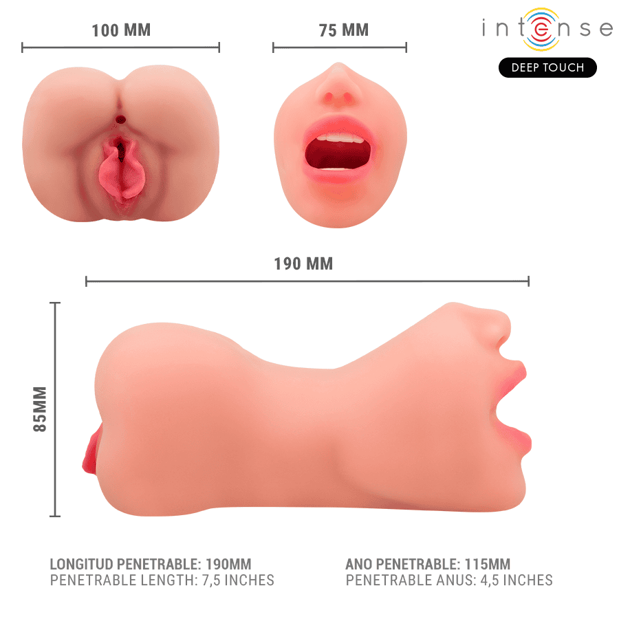 Délka masturbátoru 19 cm, použitelná délka 11,5 cm, průměr části s ústy 7,5 cm, průměr části s vaginálním a análním otvorem 10 cm, výška 8,5 cm