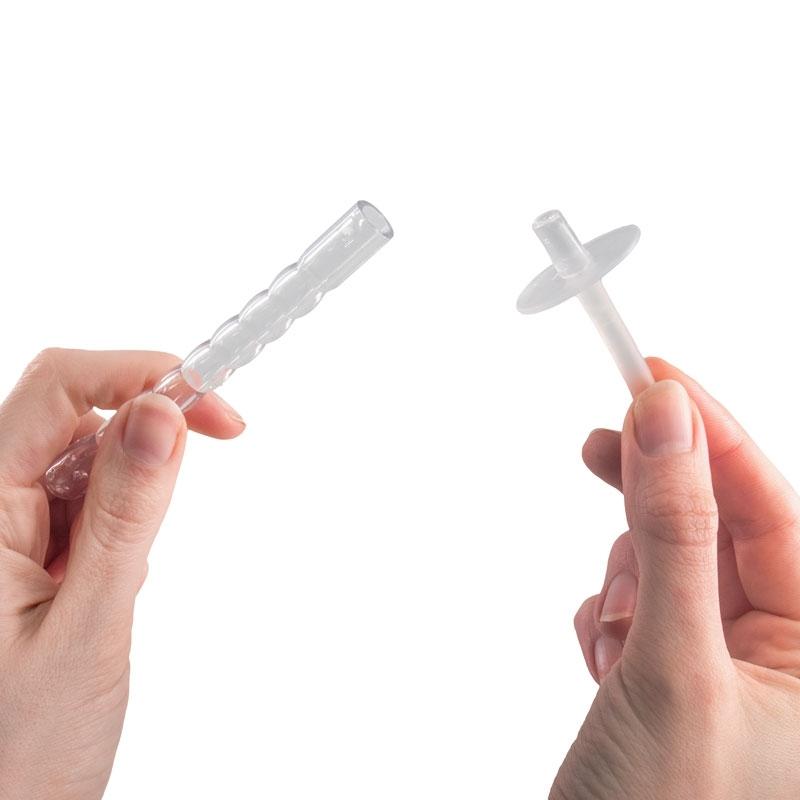 Naplň 300ml lahvičku vodou a trochou dezinfekčního spreje na erotické pomůcky. Doporučujeme použít studenou nebo vlažnou vodu, protože horká voda může poškodit materiál, ze kterého jsou hračky vyrobeny. Poté našroubuj víčko s flexibilní hadicí a čisticím nástavcem. Nyní můžeš zasunout trysku do pomůcky, kterou chceš vyčistit, a pumpovat vodu několikanásobným zatlačením na víčko lahvičky dolů.