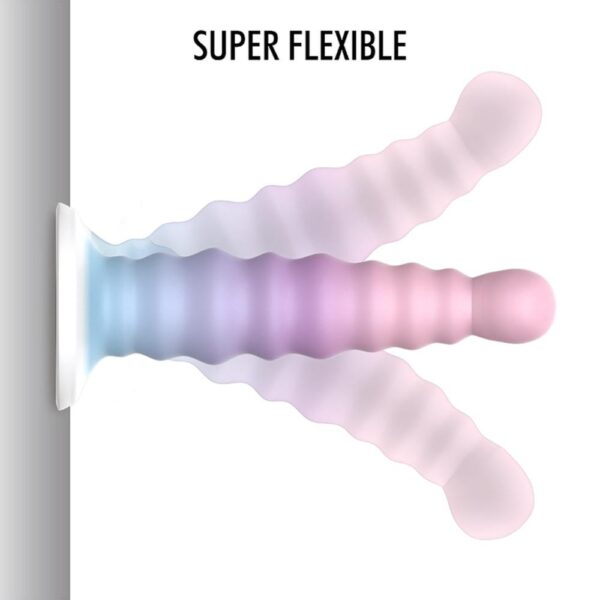 Dildo má velmi propracovaný tvar, který zajišťuje lepší stimulaci a současně vroubky zesilují vnímání při zasunování. Ale nemusíte mít obavy – silikon je příjemný částečně měkký materiál a vroubky rozhodně nejsou tvrdé a netlačí. Díky zarážce lze dildo použít i análně. Pokud jej správně přetočíte, zakřivení se může stát stimulátorem prostaty.