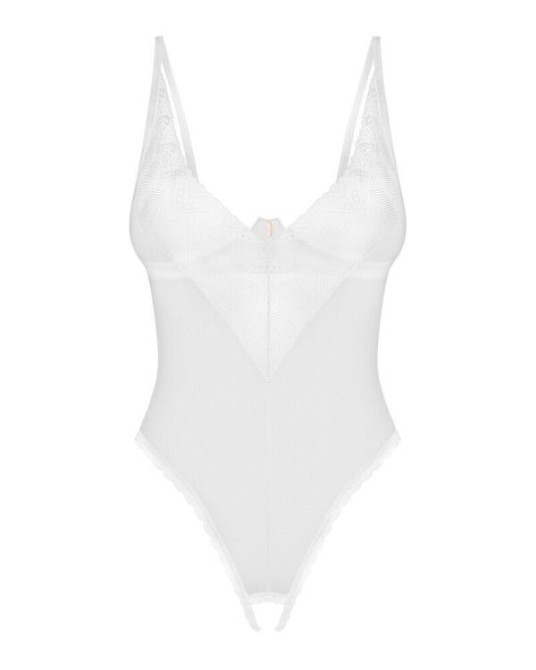 Body Alissium crotchless od značky Obsessive je v elegantní barvě – krásné a nadčasové bílé. Je měkké a elastické s jemnou krajkou. Mezi krajkovými košíčky se nachází diskrétní ozdobný detail. Podprsenka je originálně řešená – ve spodní vrstvě najdete klasickou podpěru s kosticemi. Překrývá ji vrchní elastická část, která je součástí samotného body. Ramínka podprsenky lze nastavit podle potřeby. Má velmi vysoký střih na bocích.