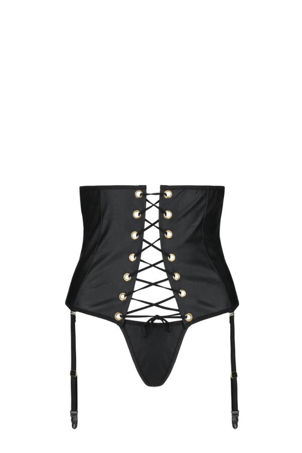 Elegantní a minimalistický podvazkový pás, který svou výškou částečně evokuje korzet. Vepředu na klasické zavazování. Pás je z elastiského materiálu, dobře se přizpůsobí postavě. Součástí balení jsou kalhotky – tanga.