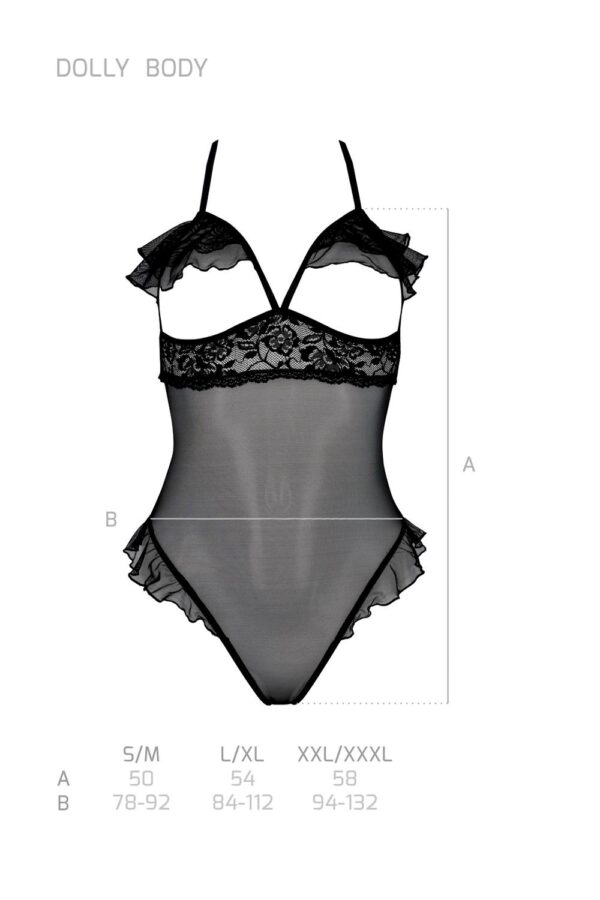 Sexy body, které vypadá úžasně na každé ženské postavě. Je vyrobeno z elastického tylu, který dokonale obepíná postavu a zvýrazňuje její křivky. Přední stranu zdobí krajkové vsadky a působí neuvěřitelně žensky. Body má otevřené košíčky „open bra“ a koketní zdobení v podobě volánů.