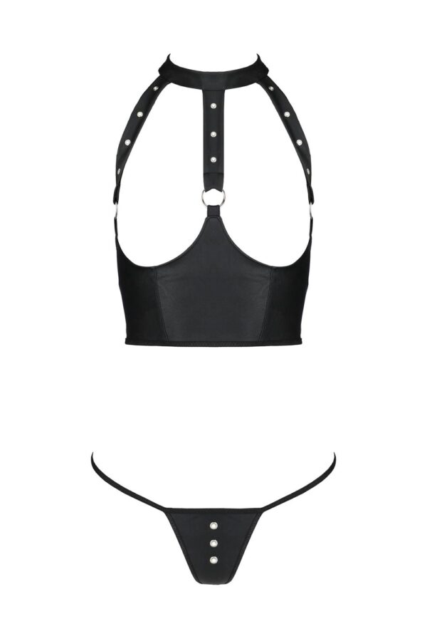 Top má zapínání za krkem a korzetové zapínání na zádech a kalhotky jsou střihem klasická tanga. Oboje je zdobeno kovovými prvky, které dodávají celému kompletu lehkou drsnost.