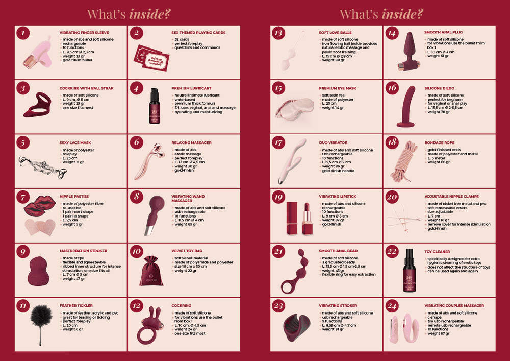 Uvnitř najdeš výběr erotických hraček, intimních doplňků a smyslných pomůcek.