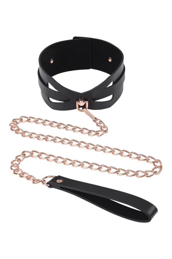 Obojek je velice luxusní nejen díky materiálu, ale i svému netradičními designu. Kovové prvky jsou v barvě růžového zlata.