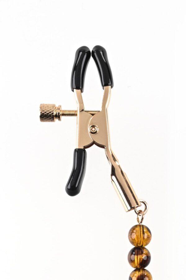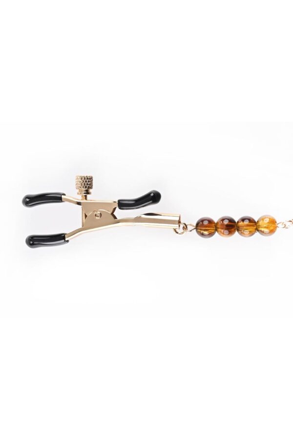 Tyto svorky na bradavky jsou unisex a velmi snadno se používají! Kov je v elegantní zlaté barvě ozdobené korálky a řetízky. Jsou utažitelné a gumové návleky na špičkách zaručují, že svorka nesklouzne a bude držet na svém místě i při dotyku či pohybu. Řetízky nabízejí možnost rozvinout hru o smyslné tahání, čímž se ještě zvýší stimulace bradavek.