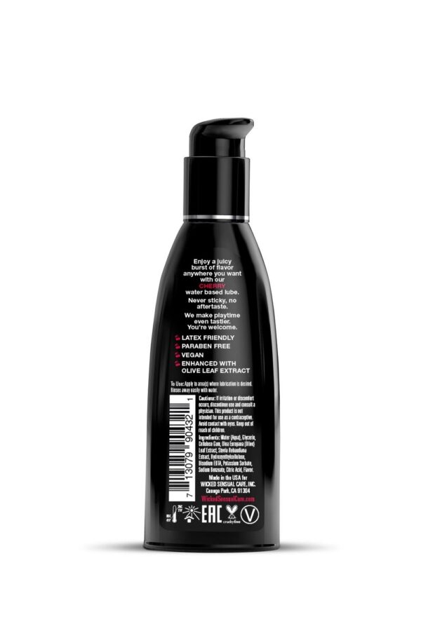 Slíbatelný a lahodný lubrikant Wicked Aqua Cherry má jemnou a lahodnou přirozenou chuť pro zlepšení orálních požitků. Tato lehká a hedvábná receptura na vodní bázi je dokonalou smyslnou kombinací elegantního lubrikantu a chuťového vjemu. Wicked Aqua Cherry uspokojí vaši chuť na sladké a vaše intimní touhy v jednom. Orální sex nikdy nechutnal tak dobře. Ať už dáváte nebo dostáváte, naše příchutě vám dodají nové sexy zážitky.